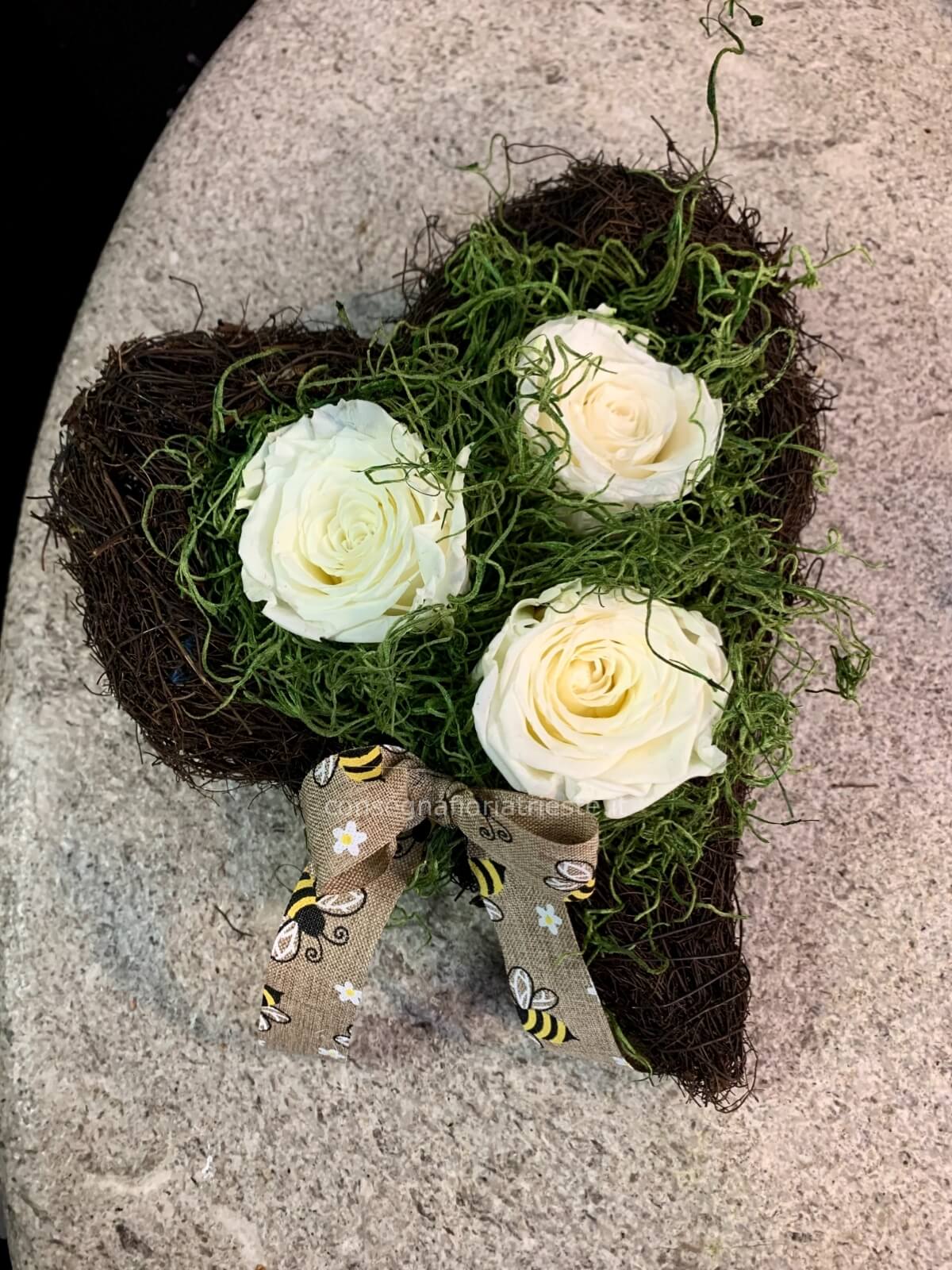 composizione con 3 rose stabilizzate in cuore di vimini
