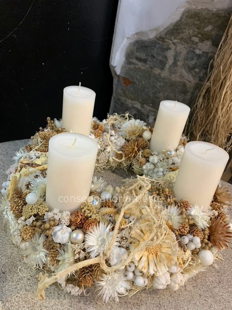 Scegli la qualità, scegli il nostro Fiorista Trieste per la tua Corona Avvento Extra Bianca e fai brillare il tuo Natale!Corona dell'Avvento di fiori secchi , diametro 50 cm circa, con candele (13x7cm) e decori natalizi naturali e artificiali.