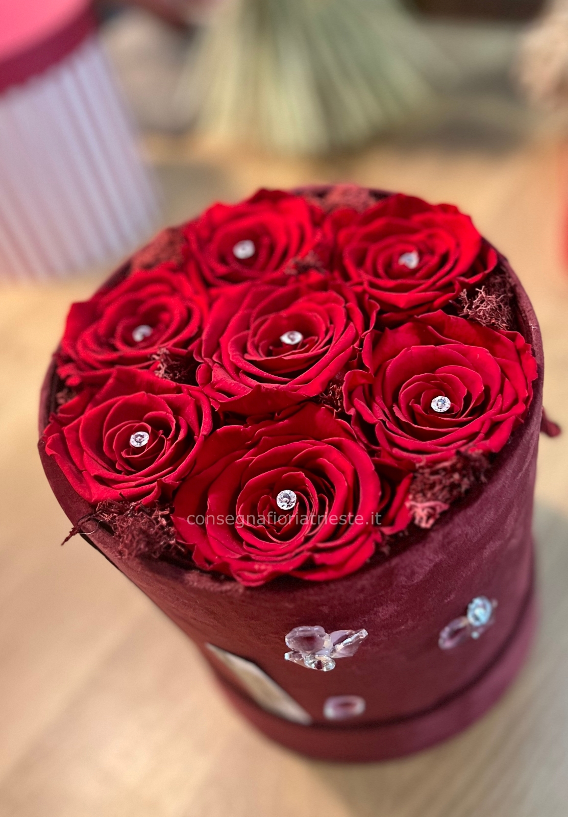 | scatola in velluto bordo' con rose stabilzzate diam. 17x20 cm Cod. 46309 | € 98,00 | Quantità : | |